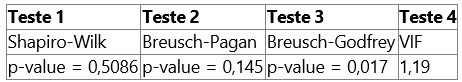Considerando os pressupostos do Modelo Clássico de Regressão Linear (MCRL), identifique, para cada teste estatístico apresentado, qual pressuposto está sendo avaliado e interprete seu resultado com base no nível de significância de 5%. Indique se a hipótese nula deve ou não ser rejeitada e se o pressuposto está sendo atendido ou violado. Sua resposta deverá ter entre 5 e 12 linhas.